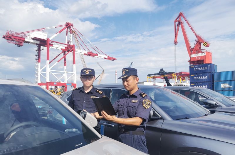 圖為:海關關員監(jiān)管新能源汽車出口 李健/攝