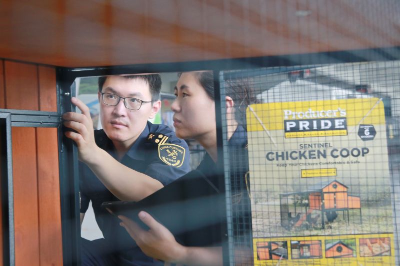 圖為:海關(guān)關(guān)員查驗(yàn)出口寵物房屋 石萬里/攝