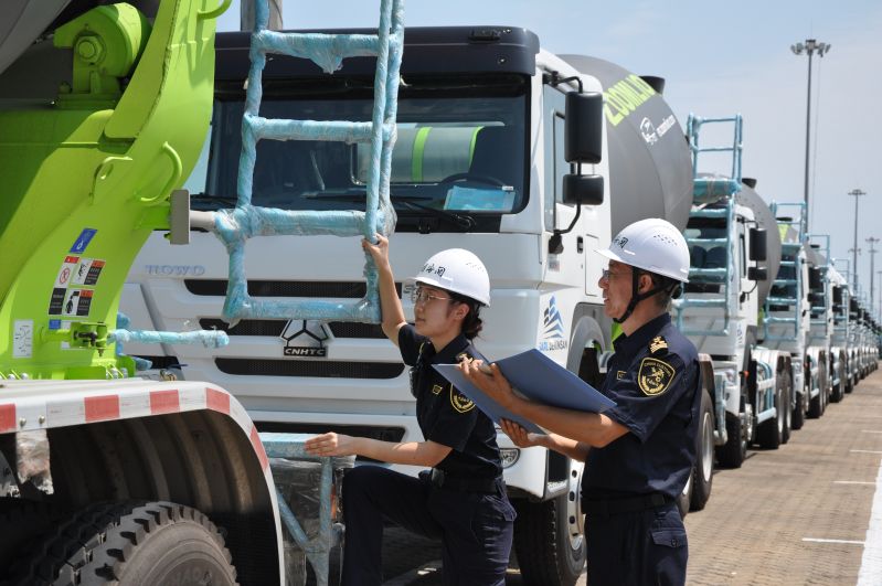 圖為:海關(guān)關(guān)員現(xiàn)場監(jiān)管查驗(yàn)出口幾內(nèi)亞工程車輛 蔡子揚(yáng)/攝