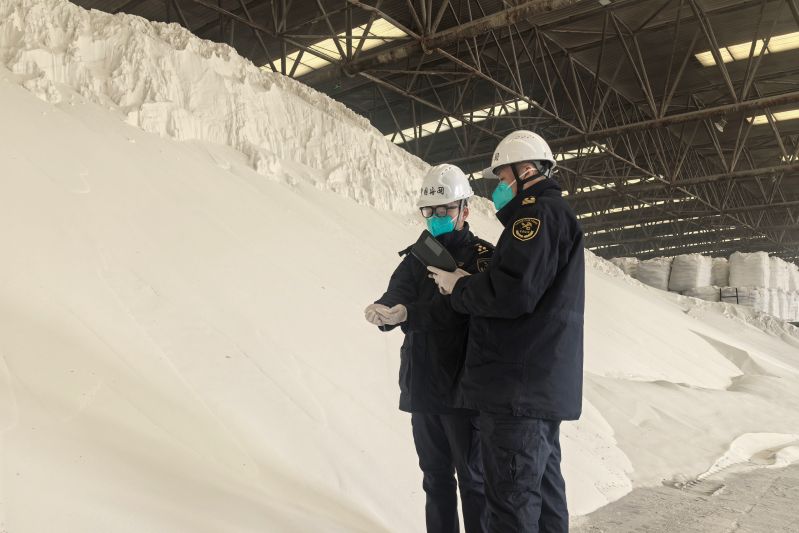 圖為:海關(guān)關(guān)員對進口化肥進行現(xiàn)場查驗 關(guān)景元/攝