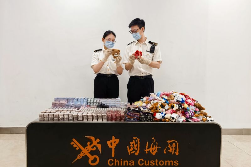 圖為:海關(guān)關(guān)員查獲超量攜帶進(jìn)境玩偶等物品 董巖/攝
