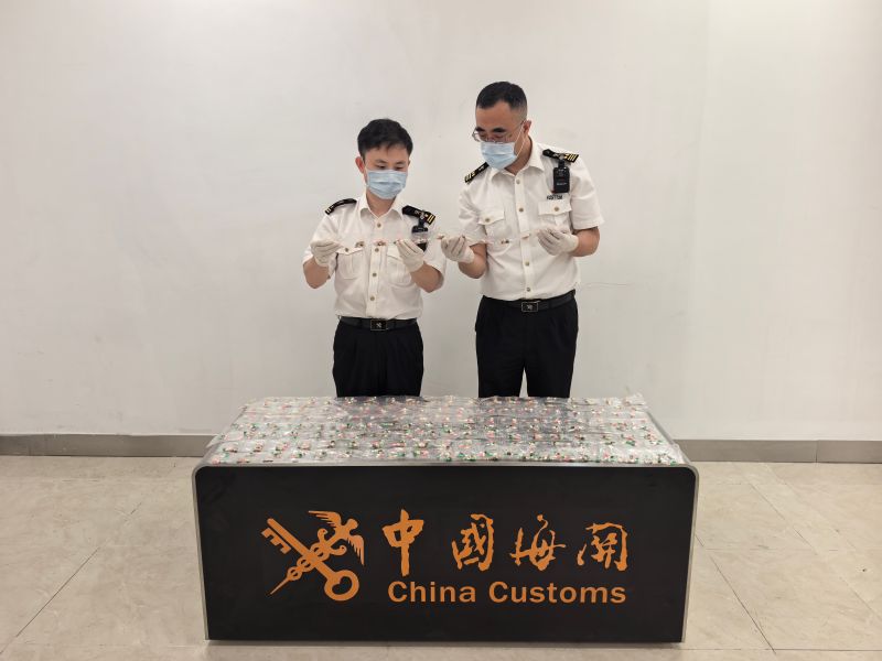 海關(guān)關(guān)員在對入境航班進行監(jiān)管時,發(fā)現(xiàn)一名旅客手提行李過機圖像異常,遂進行開包查驗,在其行李內(nèi)發(fā)現(xiàn)“三無”減肥產(chǎn)品2310粒。經(jīng)檢測呈甲基安非他明和可卡因陽性。